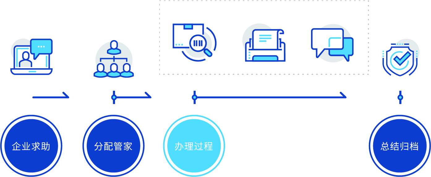 当企业有复杂问题时,平台提供业务管家为企业提供全程协助,并记录帮办过程,接收企业满意度评价。